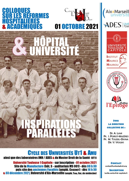 Le présent cycle de colloques, organisé en deux journées distinctes (Toulouse, 01 octobre 2021 & Marseille, 03 décembre 2021) dans un souci de pluridisciplinarité, ambitionne d’examiner les réformes de l’hôpital et de l’Université à travers ce double prisme. Dans cette perspective, il réunit, pour la première fois, des spécialistes du droit hospitalier et du droit de l’enseignement supérieur. La première journée s’efforcera d’interroger les points de convergence entre réformes hospitalières et universitaires et leurs limites. La seconde abordera le partenariat naturel né des ordonnances de 1958 et les mutations à l’œuvre dans la formation des professionnels de santé.