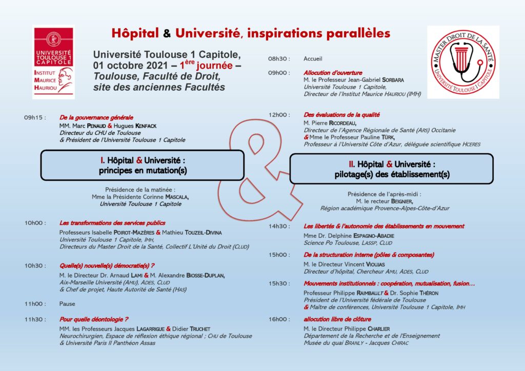 Le présent cycle de colloques, organisé en deux journées distinctes (Toulouse, 01 octobre 2021 & Marseille, 03 décembre 2021) dans un souci de pluridisciplinarité, ambitionne d’examiner les réformes de l’hôpital et de l’Université à travers ce double prisme. Dans cette perspective, il réunit, pour la première fois, des spécialistes du droit hospitalier et du droit de l’enseignement supérieur. La première journée s’efforcera d’interroger les points de convergence entre réformes hospitalières et universitaires et leurs limites. La seconde abordera le partenariat naturel né des ordonnances de 1958 et les mutations à l’œuvre dans la formation des professionnels de santé.
