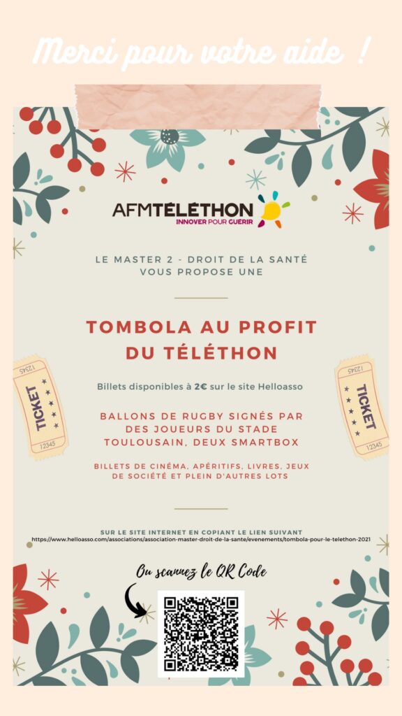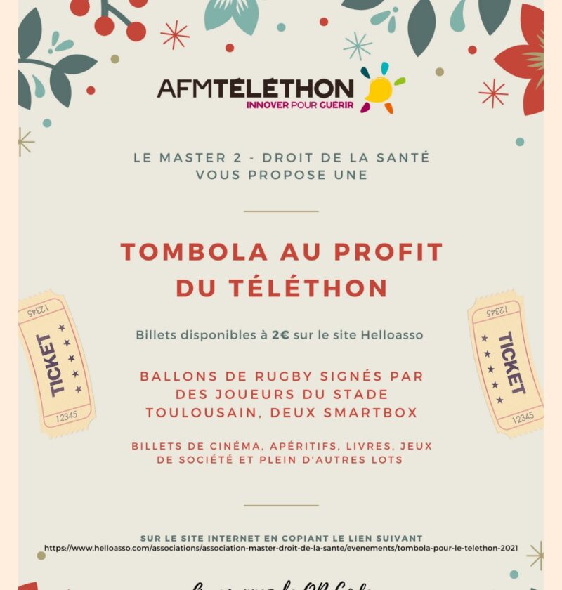 L’Association du Master Droit de la Santé intervient bénévolement auprès de l’AFM-Téléthon de Haute-Garonne pour l’édition 2021 du Téléthon. Dans ce cadre, nous avons déjà effectué une vente de gâteaux aux Carmes le 5 décembre dernier et nous organisons à présent une tombola, ouverte jusqu’au 27 janvier 2022. Nous proposons ainsi la vente de billets de tombola au prix de 2 euros permettant le gain potentiel de divers lots (smartbox, billets de cinéma, apéritifs, libres, jeux de société…). Le tirage sera réalisé fin janvier et les recettes ainsi récoltées seront reversées au profit de l’AFM-Téléthon.