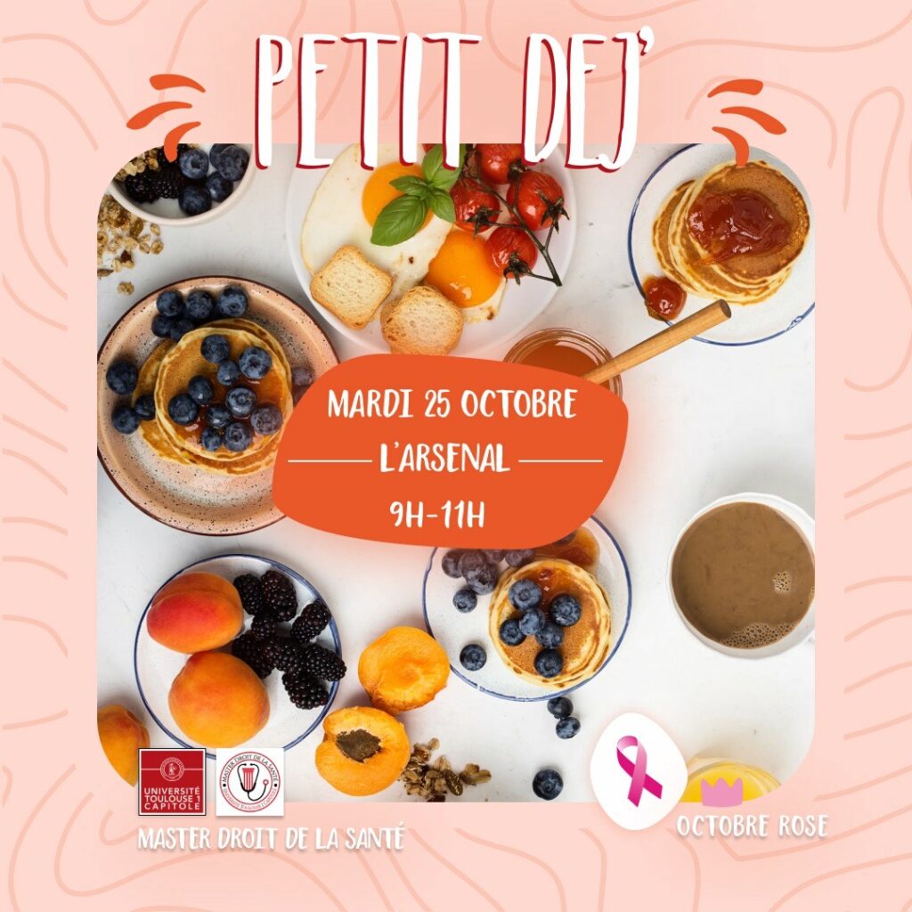 Le Master Droit de la Santé de l’Université Toulouse 1 Capitole, dans le cadre notamment du mois #octobrerose de sensibilisation relative au cancer du sein, propose un nouveau petit-déjeuner ce mardi 25 octobre sur le site de l’Arsenal et ce, de 9h à 11h.